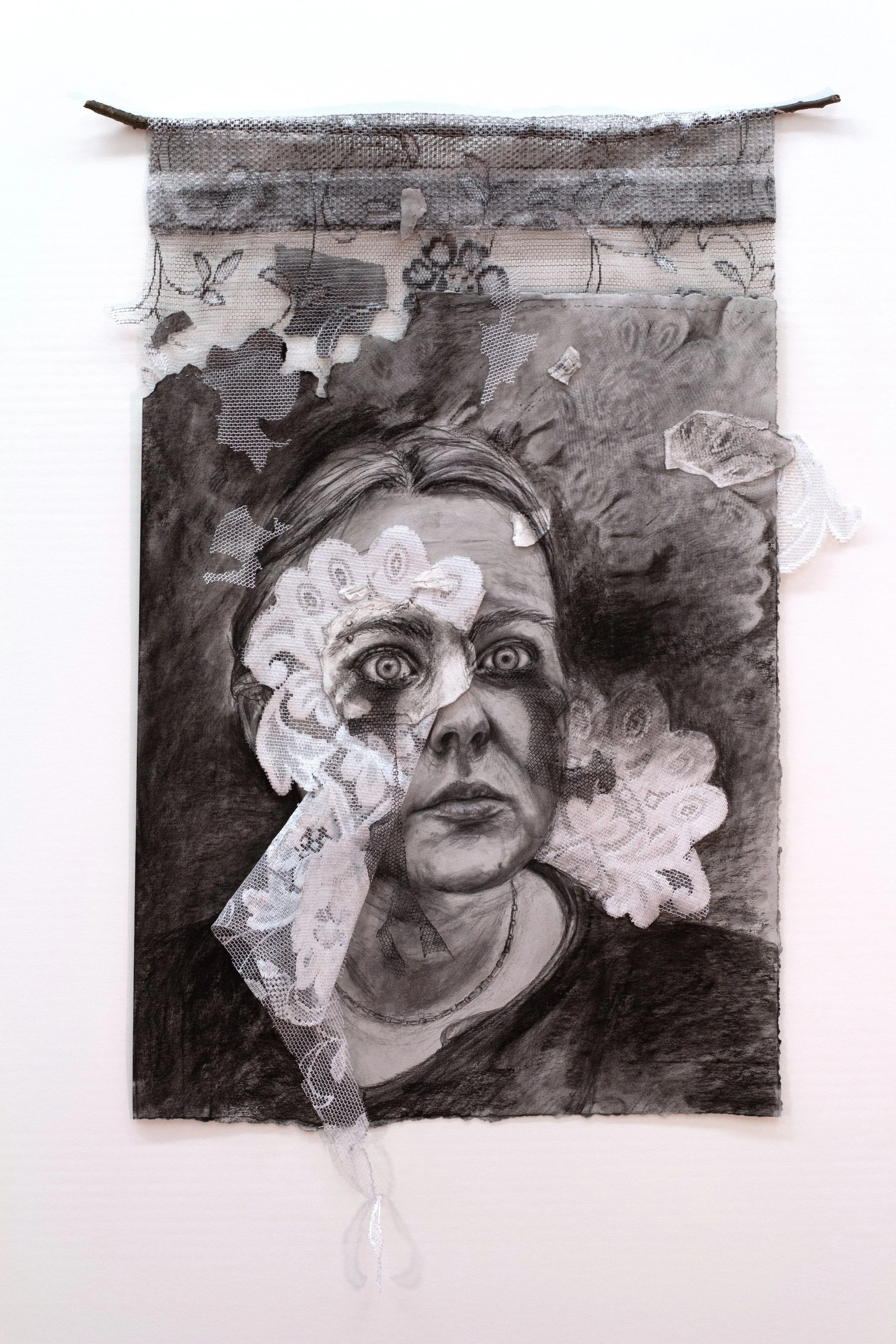 Processing Change Hannah Weck16.5"x30" charcoal, paper, fabric, and thread, with stick2024 View fullsize View fullsize
